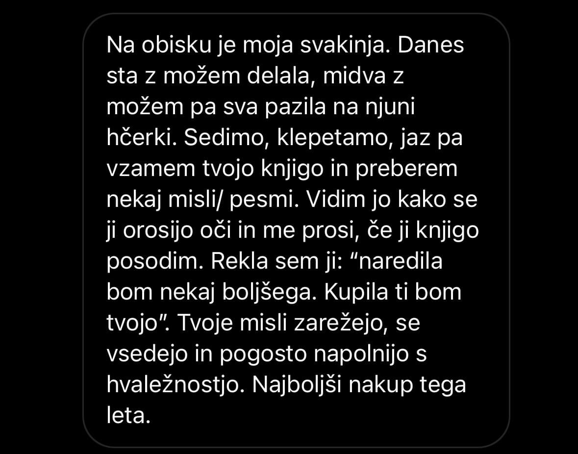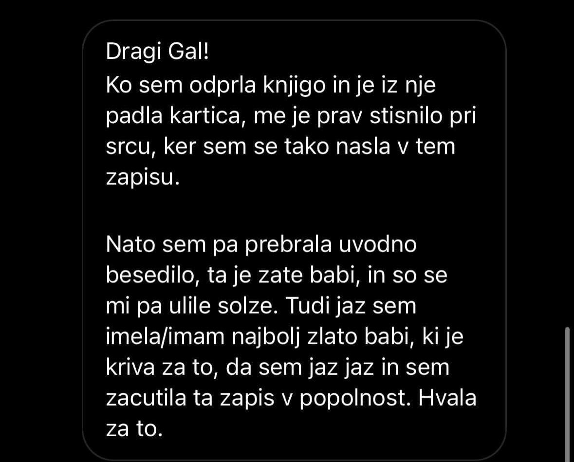 Lahko pa z gotovostjo napišem, da sem (oziroma smo, skupaj z vami) ustvaril eno najbolj čudovitih, sprejemajočih in ljubezni polnih skupnosti v Sloveniji, kar mi daje moč in vrača vero ter upanje v ta svet.